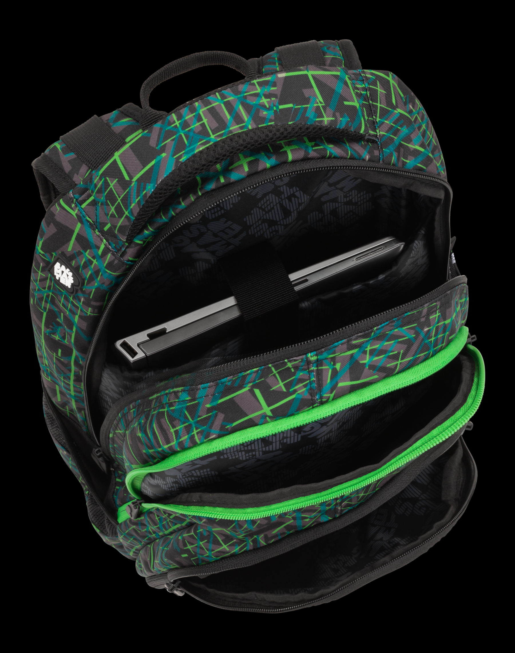 Hlavná komora je veľmi priestorná vhodná na školské dosky, tak na učebnice. Súčasťou hlavnej komory je vystužené vrecko na notebook do 15"" Prepásané popruhom na suchý zips k fixácii notebooku. Rozmery vrecka na notebook 29 x 28 x 4 cm. Na chrbte batohu je vrecko na zips, ktoré skrýva vystužené vrecko na MP3 prehrávač s vývodom na sluchátka v hornej časti. Rozmery vrecka na MP3 prehrávač (12 x 14 x 2 cm). V tomto špeciálne skrytom vrecku sú 2 sieťované vrecká na zips. A vo vnútri je ešte popruh na suchý zips napr. k prevlečeniu sluchátiek alebo na zaveseniu kľúčov a pod. Do tohto vrecka je možné vložiť zošit A4.