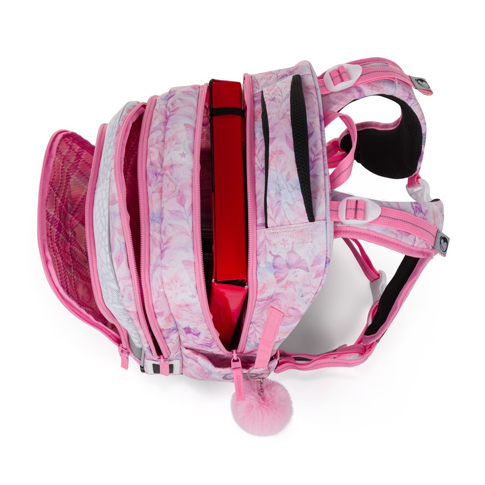 Má tri priestranné priehradky. Do hlavného sa zmestia veľké školské zakladače, ako aj učebnice a zošity formátu A4. Hlavná priehradka má kompresné vrecko s elastickými bočnými popruhmi na zakladače A4 a veľké učebnice. Pomáha ťahať a držať ťažké pomôcky čo najbližšie k chrbtu, takže školák alebo školáčka má ťažisko blízko chrbtice a pri chôdzi sa nehrbí.