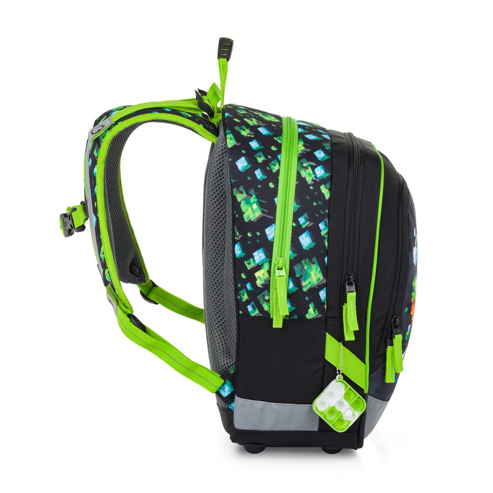 Ľahký trojkomorový školský batoh s kockovým motívom pre malých hrdinov. Obľúbia si ho deti aj rodičia. Vhodný od prvej do tretej triedy. Kvalitný systém pre zdravú chrbticu, organizér a praktické vrecká, do ktorých si školák prehľadne usporiada učebnice aj pomôcky. Súčasťou setu je zladený peračník a vrecúško.