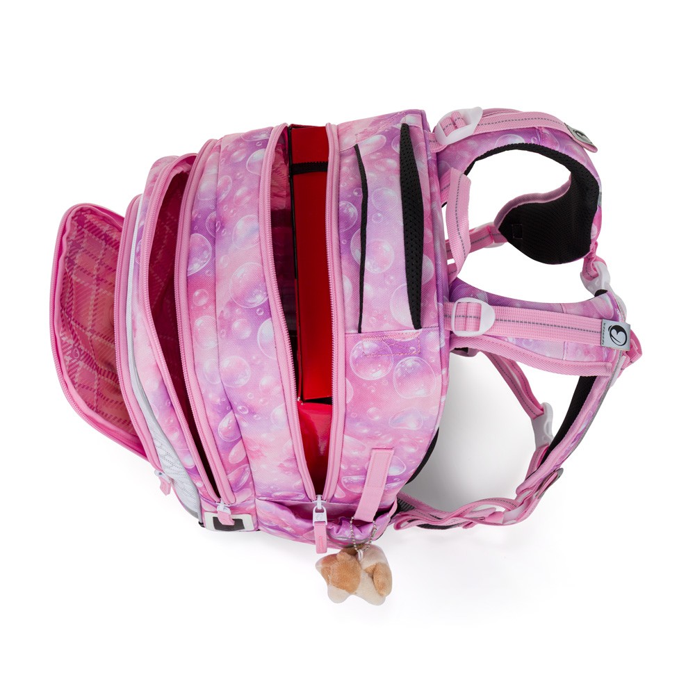 Ramenné popruhy a chrbtový systém sú mäkko polstrované. Popruhy sú nastaviteľné pomocou hornej a dolnej plastovej pracky. Dĺžku je potrebné upravovať podľa toho, ako školáčka rastie. Konce popruhov sú magnetické. Aby sa nezosúvali, stačí ich pomocou magnetu pripnúť na plastovú pracku.