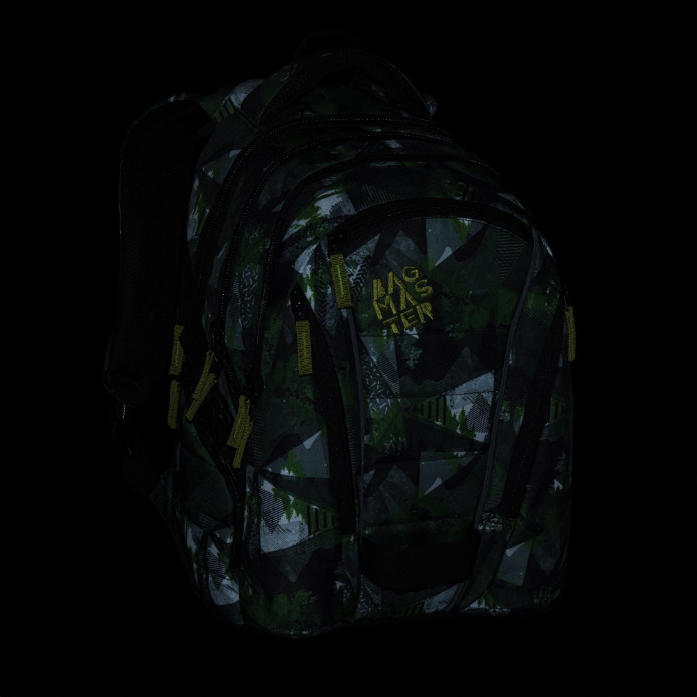 Zeleno-šedý školský batoh pre školákov od 4. triedy, ktorí potrebujú priestor na veľa vecí. Má tri priestranné komory s polstrovanou priehradkou na 15" notebook a množstvo menších vreciek na rôzne predmety. Do bočných vreciek sa zmestí aj 1,5-litrová fľaša. Chrbát batohu je anatomicky tvarovaný a mäkko polstrovaný. Rovnako ako ramenné popruhy. V malej priehradke sa nachádza organizér a odnímateľný klip na kľúče. Na bokoch sú kompresné popruhy na úpravu hĺbky batohu alebo na pripevnenie fľaše. Samozrejmosťou sú reflexné prvky.