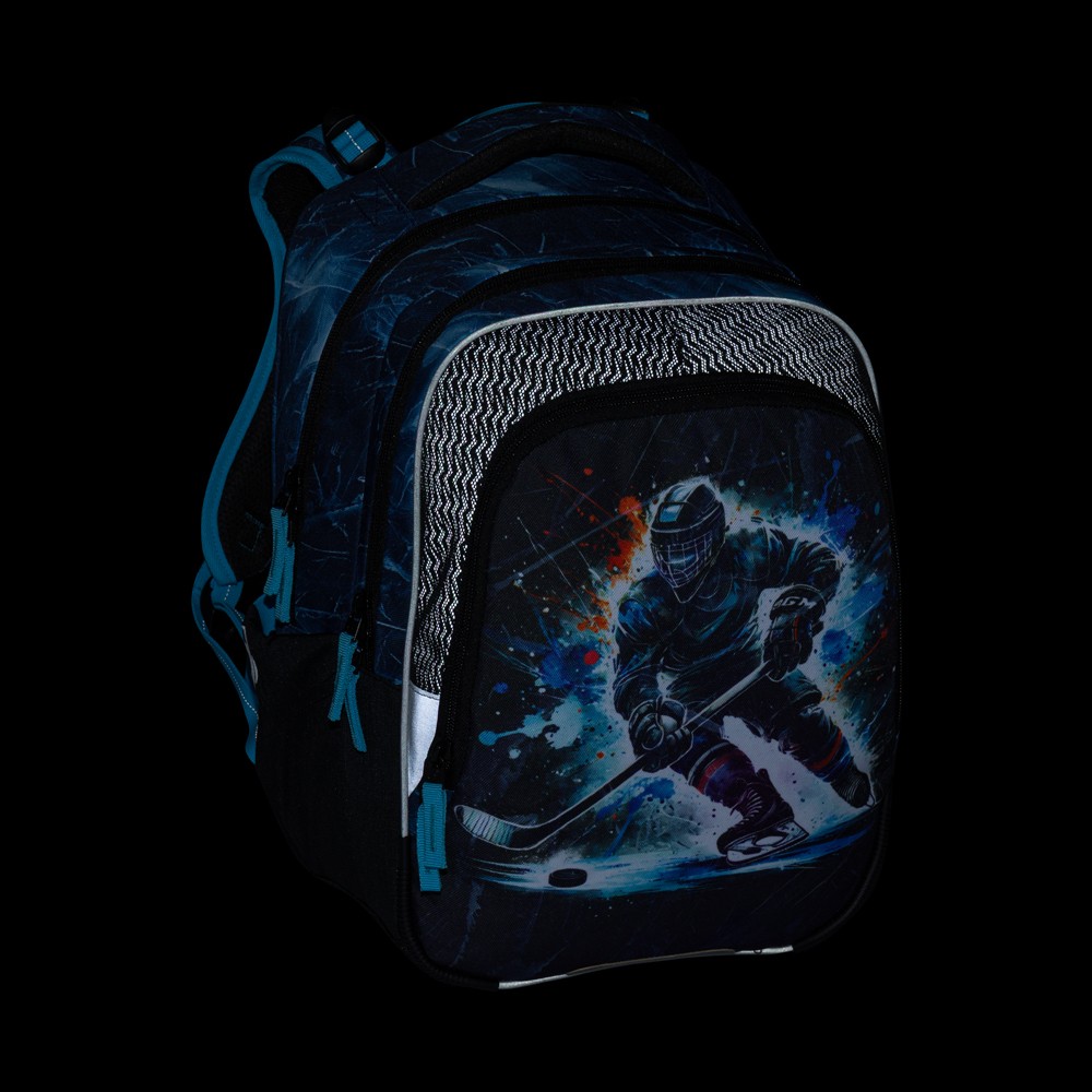 Trojkomorový školský super batoh pre prvákov, ktorí milujú hokej. Váži menej než jeden kilogram, má nový bezpečný chrbtový systém s bedrovým pásom, reflexné prvky, praktický organizér aj bočné vrecko na fľašu. Sieťovina na anatomicky tvarovaných popruhoch a chrbtovej časti je mäkká a neškriabe. Set obsahuje plnú výbavu: zladený peračník, vak, krabičku na desiatu a fľašu.